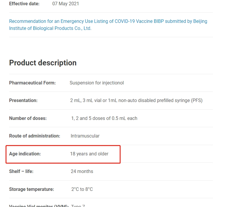 ▲在世衛(wèi)組織的官方網(wǎng)站中,已將國藥集團中國生物北京生物制品研究所新冠滅活疫苗推薦使用年齡調(diào)整為18歲及以上人群。